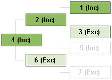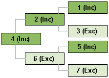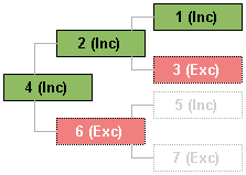 The green and light green boxes would appear in an actual chart. The other boxes would be suppressed. The example boxes have an ID number that is used in the text. The suffix "(Inc)" means included, and "(Exc") means excluded. It is not important why a person is included or excluded; once the determination has been made that a person is included or excluded, the chart membership logic is consistent.