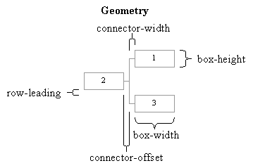 The Box Width, Box Height, Connector Offset, Connector Width, and Row Leading properties control the geometry of the chart.