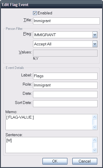 The Flag Event title is "Immigrant" and it uses a custom flag of the same name. All values of the Immigrant flag are acceptable. The Label is set to "Flags", and so the Tag Group that renders the Virtual Event must accept tags with that Label. The Role is set to "Immigrant". The value of the flag is shown via the [:FLAG-VALUE:] code used in the Memo.