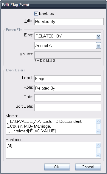 The values of the Related_By flag are not as intuitive as the Y/N codes in the Immigrant flag. To make the values understandable, this Flag Event uses the [FLAG-VALUE:] ... [:FLAG-VALUE] code to convert the flag values to definitions.