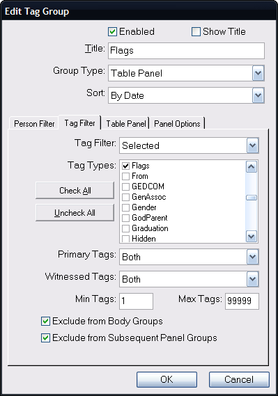 Note that the Tag Group above is configured to select a single Tag Type named "Flags". That is not an actual Tag Type in the TMG project; the Labels assigned to Flag Events appear in the list of Tag Types in the Tag Group definition.