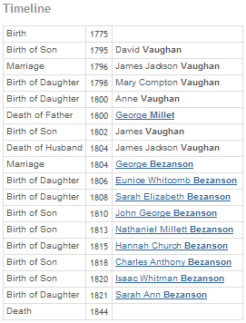 The example person page entry below shows a set of virtual events (Birth of Son, Birth of Daughter, etc.) mixed with Birth, Marriage, and Death events and rendered in a Table Panel via the Tag Groups feature. The result is an abbreviated "timeline" for the subject, Mary Millet.